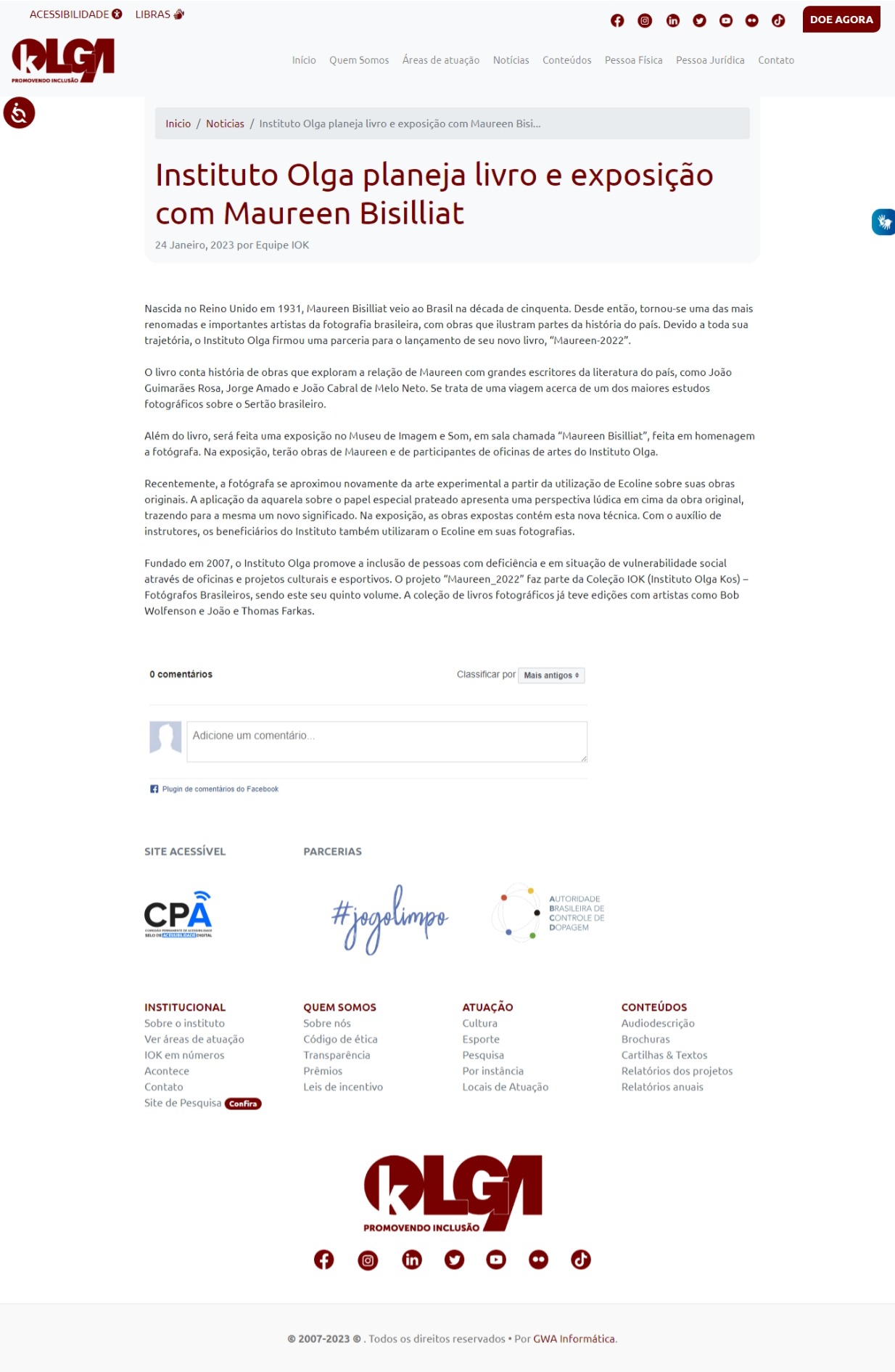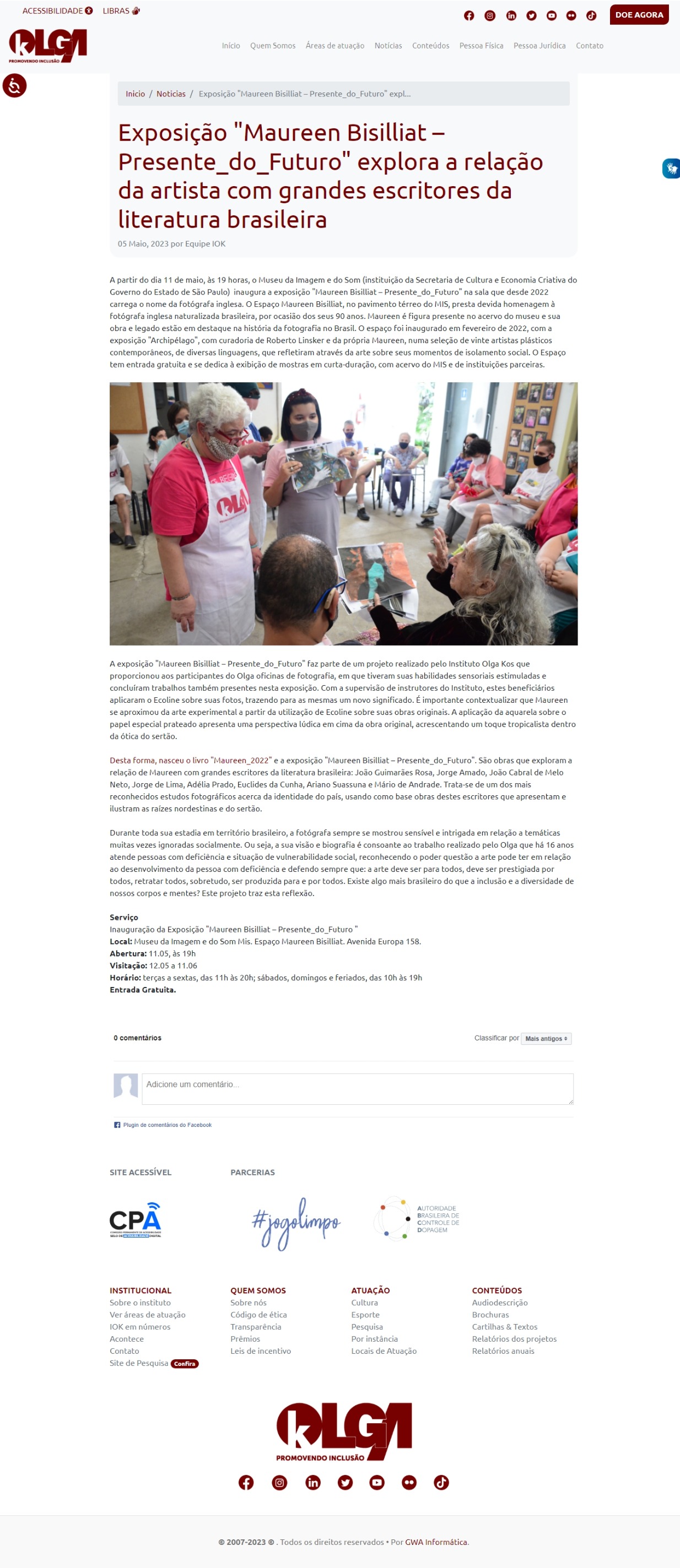 | Publicação Site - 24 Janeiro, 2023 | https://institutoolgakos.org.br/noticia/instituto-olga-planeja-livro-e-exposio-com-maureen-bisillia | Abrir Cliping |